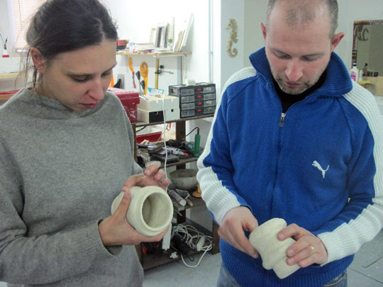 La seconda fase prevedeva la formatura delle vertebre. Innanzitutto ho realizzato la matrice e successivamente lo stampo in gesso; con lo stampo ho potuto formare le vertebre in argilla. Estratte le vertebre grezze, le ho lasciate asciugare finchè non hanno raggiunto la durezza “cuoio” (termine ceramico), quindi le ho rifinite e lavorate affinché dopo la cottura si potessero accoppiare senza problemi. Dopo circa sette giorni le vertebre erano completamente asciutte e pronte per essere cotte 1050° C seguendo un ciclo di cottura della durata di circa 12 ore. Due giorni dopo ho potuto estrarre le vertebre “biscottate”. Le ho quindi smaltate, messe in forno e portate ad una temperatura di 1250° C con un ciclo di cottura durato circa 11 ore. Due giorni dopo le vertebre erano pronte.
